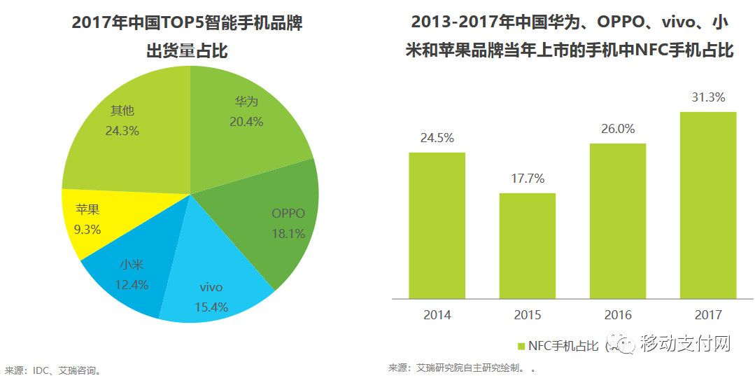 據(jù)艾瑞統(tǒng)計,在國內(nèi)出貨量TOP5的智能手機(包括華為、OPPO、vivo、小米和蘋果)當中,2014-2017年上市的手機中NFC手機占比得到了明顯的增長,其中2015年的占比僅為17.1%,但到2017年則增長到了31.3%。