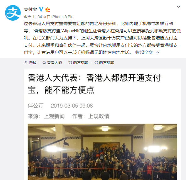 而來自香港的人大代表譚耀宗對記者表示,港人希望有更多的方便。比如,要開銀行戶口也要到內(nèi)地來,希望香港也能辦這個手續(xù),包括開通支付寶。