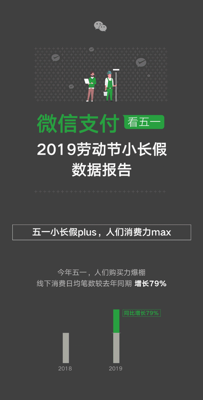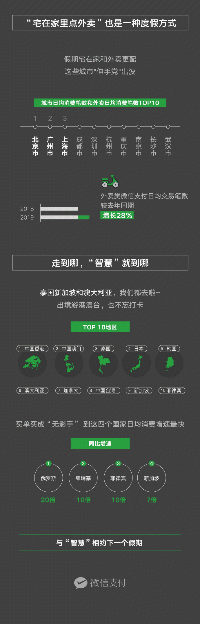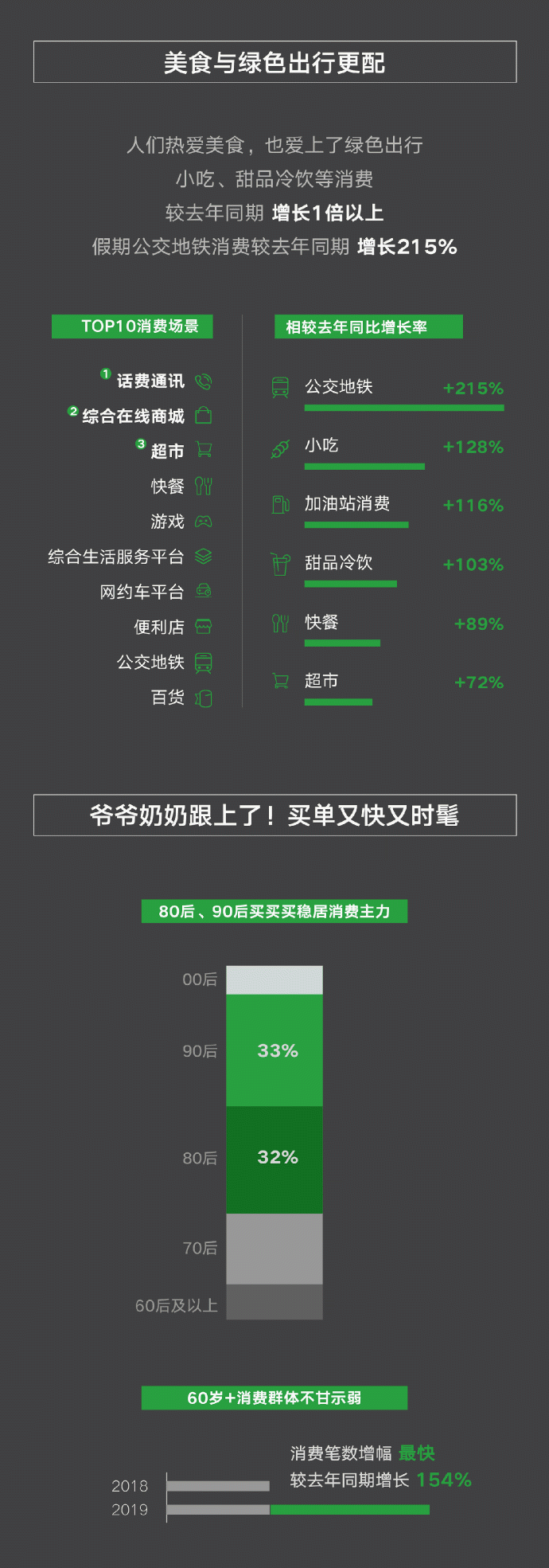 2019年5月7日,微信支付發(fā)布《2019勞動節(jié)小長假數(shù)據(jù)報告》。報告中顯示,五一期間微信用戶線下消費日均筆數(shù)較去年同期增長79%,假期公交地鐵消費較去年同期增長215%。值得一提的是,雖然目前80后、90后仍是移動支付消費主力軍,但是60歲以上的消費群體消費筆數(shù)增幅最快,較去年同期增長154%。此外,五一期間出國旅行消費的用戶也不在少數(shù),其中,俄羅斯、柬埔寨、菲律賓、新加坡四地的日均消費增速最快。