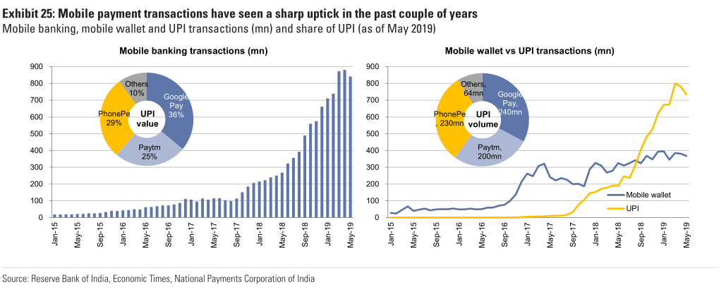 除了上述電子支付平臺,印度電子支付市場還有另外一大玩家——印度國家支付公司。其于2016年推出了統(tǒng)一支付接口UPI(Unified Payments Interface),允許用戶直接使用銀行賬戶內(nèi)的存款消費、轉(zhuǎn)賬,而無需事先預存在支付平臺上。2019年5月,報道稱當月UPI交易額達到220億美元,個人用戶之間轉(zhuǎn)賬占70%的交易次數(shù)。